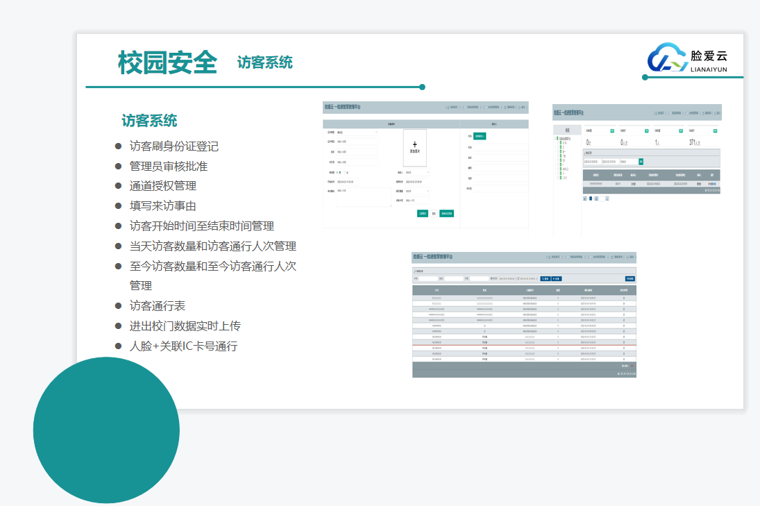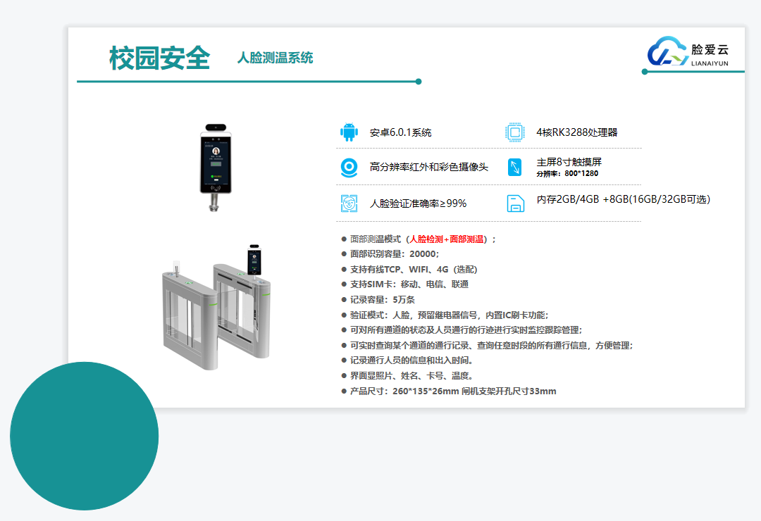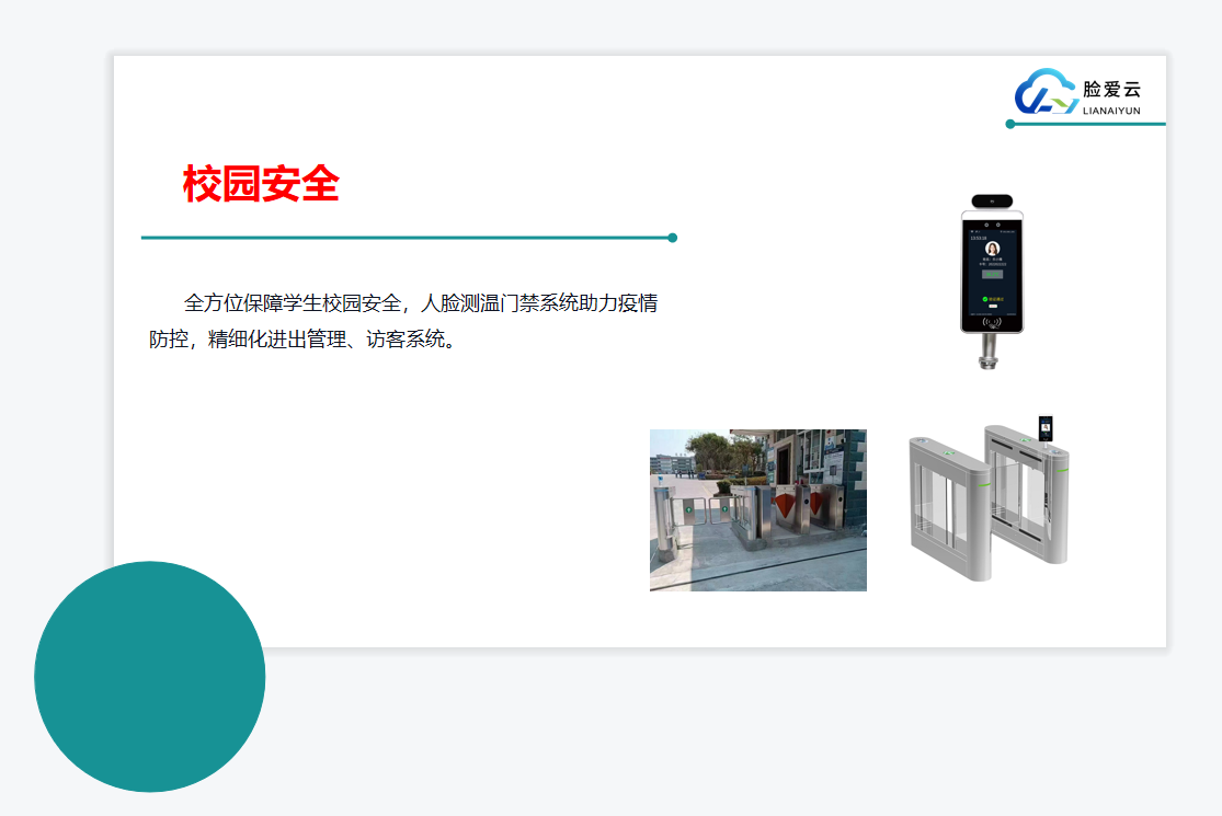 校門口:安裝智能人臉識別閘機、訪客機、和抓拍機,對出入人員進行人臉身份識別和大數據分析,充分考慮訪客系統和人員出入控制的結合,實現人臉身份驗證、出入管理、學生請假管理、簽到考勤等系列功能,滿足校園場景綜合管理的需求。